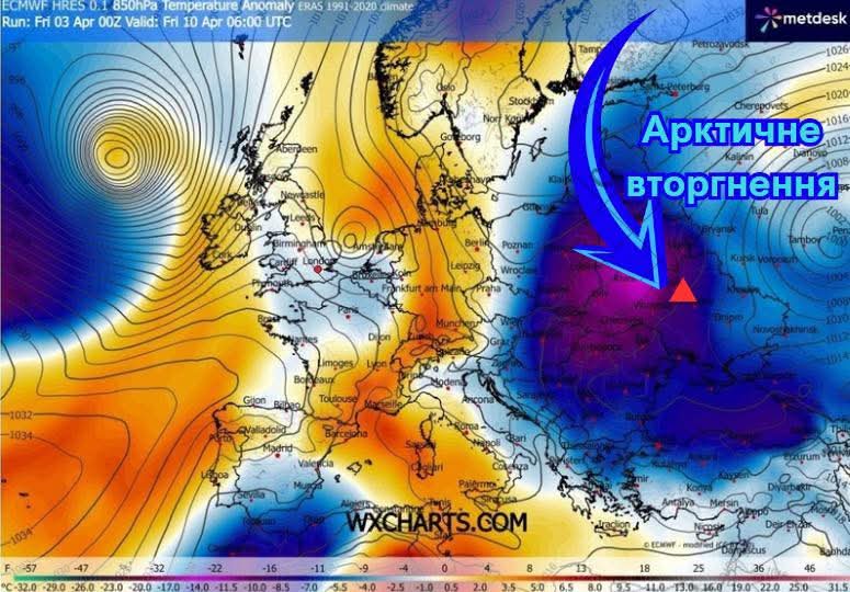 Антициклон зміститься на Скандинавію, відкривши шлях циклонам із північних морів. Активний холодний фронт принесе короткочасні дощі, місцями з грозами, та сформує меридіональний перенос арктичного повітря. У період з 7 по 9 квітня до опадів може приєднуватися навіть невеликий мокрий сніг. Температура вночі впаде до 2-7° тепла, а на поверхні ґрунту очікуються заморозки 0-3°. Вдень стовпчики термометрів покажуть лише 7-12° тепла.