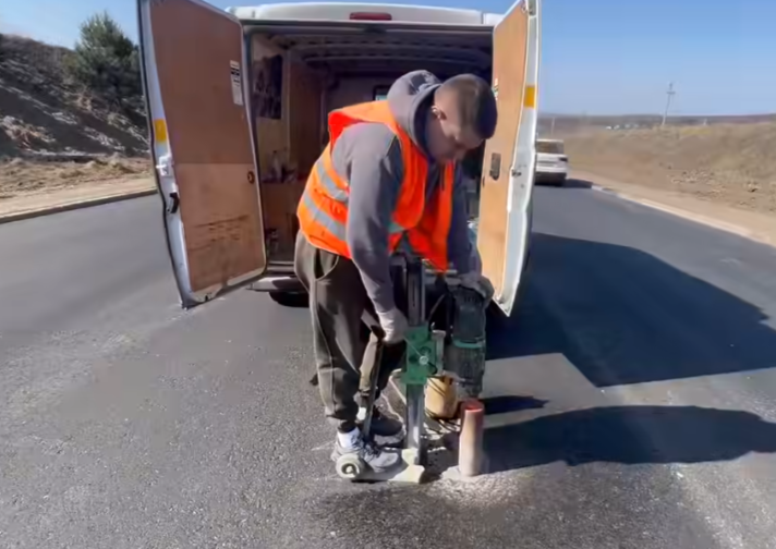 Метод кернування передбачає вирізання циліндричних зразків асфальтобетону за допомогою алмазної коронки. Отримані проби дозволяють лабораторно підтвердити фактичну товщину шару, його щільність та ступінь ущільнення. За результатами проведених замірів на місці, середня товщина покриття на тестованій ділянці становить 11 см. Ці дані будуть використані для подальшого аналізу фізико-механічних властивостей матеріалу в лабораторних умовах.
