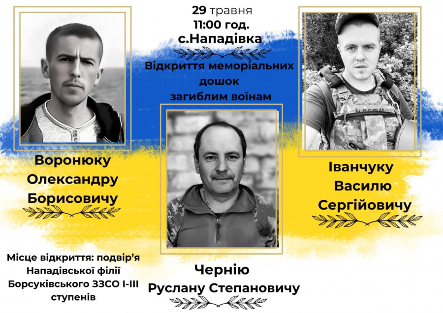 У середу, 29-го травня, у селі Нападівка відбудеться відкриття меморіальних дошок трьом полеглим захисникам – Руслану Чернію, Олександру Воронюку, Василю Іванчуку.