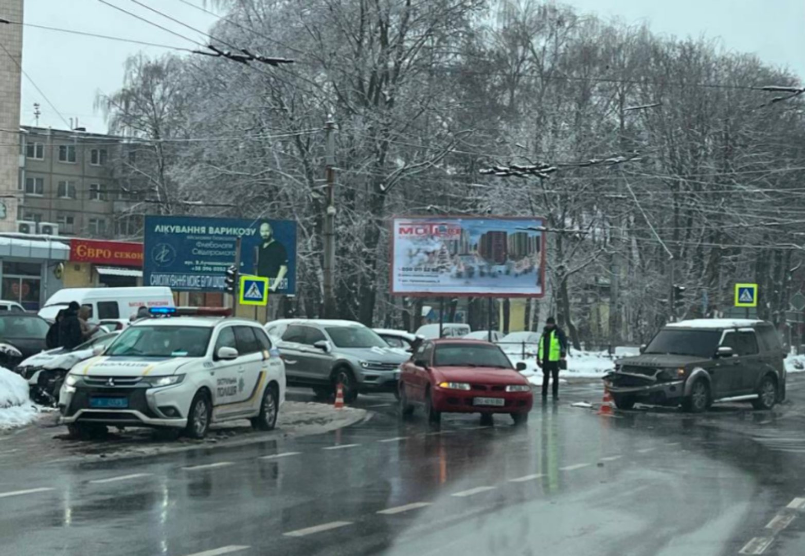 Сьогодні, 8 лютого, у Тернополі поблизу закладу «Макдональдс» на вулиці Мазепи було зафіксовано дорожньо-транспортну пригоду. Учасниками зіткнення стали службовий автомобіль патрульної поліції та позашляховик Range Rover.
